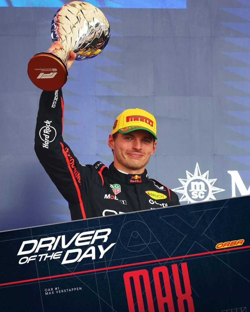 Max Verstappen con Red Bull que debió largar desde la calle de boxes hizo un carrerón hasta arribar en el 3° lugar , dejando en claro que peleará hasta el final. En el 4° lugar, con otra carrera destacada Russell con Mercedes y 5°Piastri que debió conformarse con ubicar al McLaren 5°.