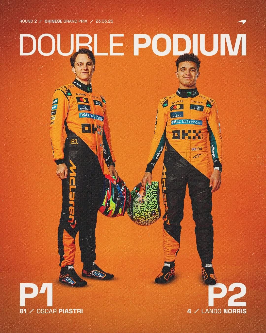 El australiano Oscar Piastri ganó con autoridad el GP de China luego de 56 vueltas al circuito de Shanghai de 5.400 metros de extensión. Su compañero Lando Norris completó el 1-2 de McLaren (doblete n°50 de la escudería inglesa en la F1).