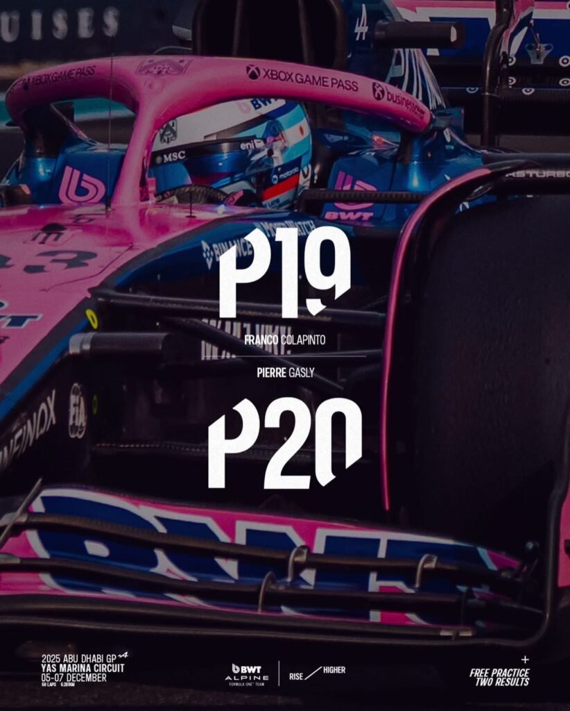 Franco Colapinto debió resignarse a terminar 20°, en una temporada para el olvido de la escudería Alpine; el A525 nunca fue confiable ni rindió lo necesario para que el piloto argentino y su compañero de equipo Pierre Gasly 19° pudieran hacer una campaña digna y sumar puntos.