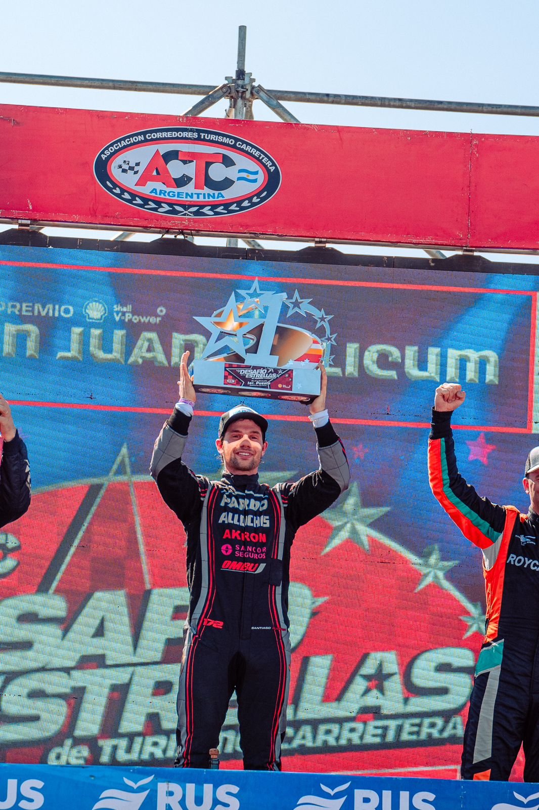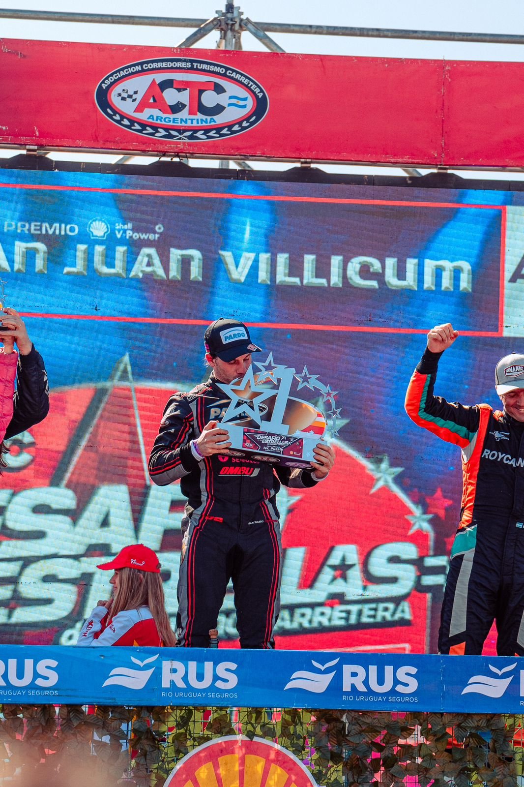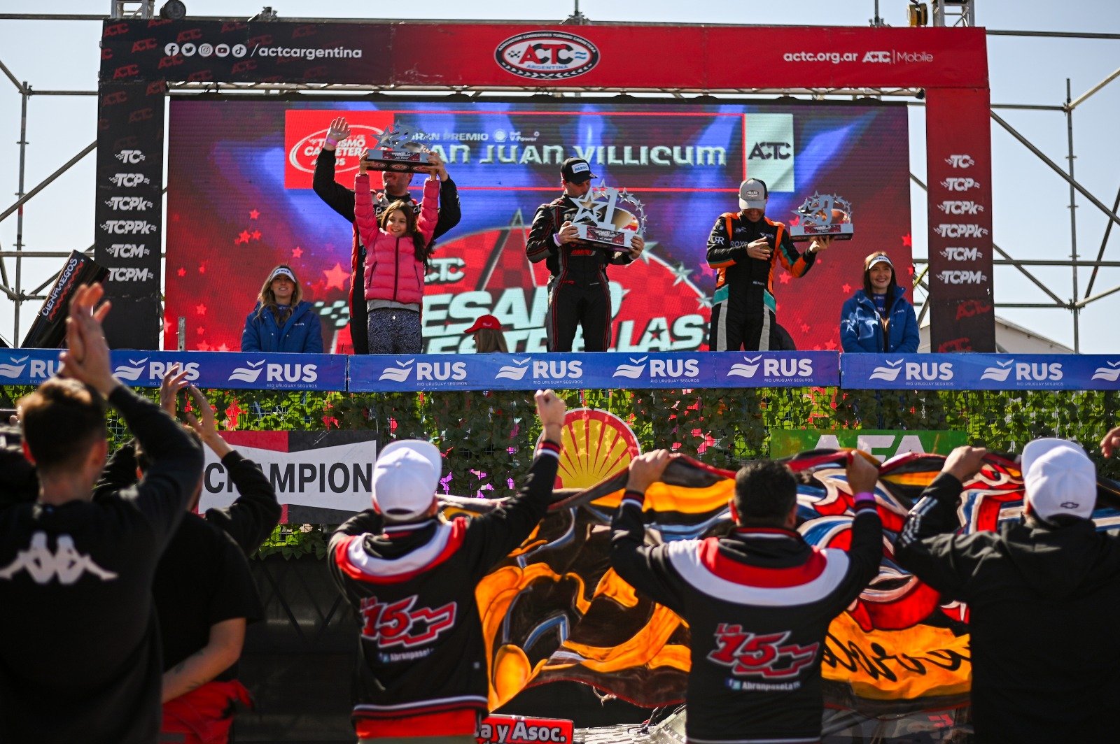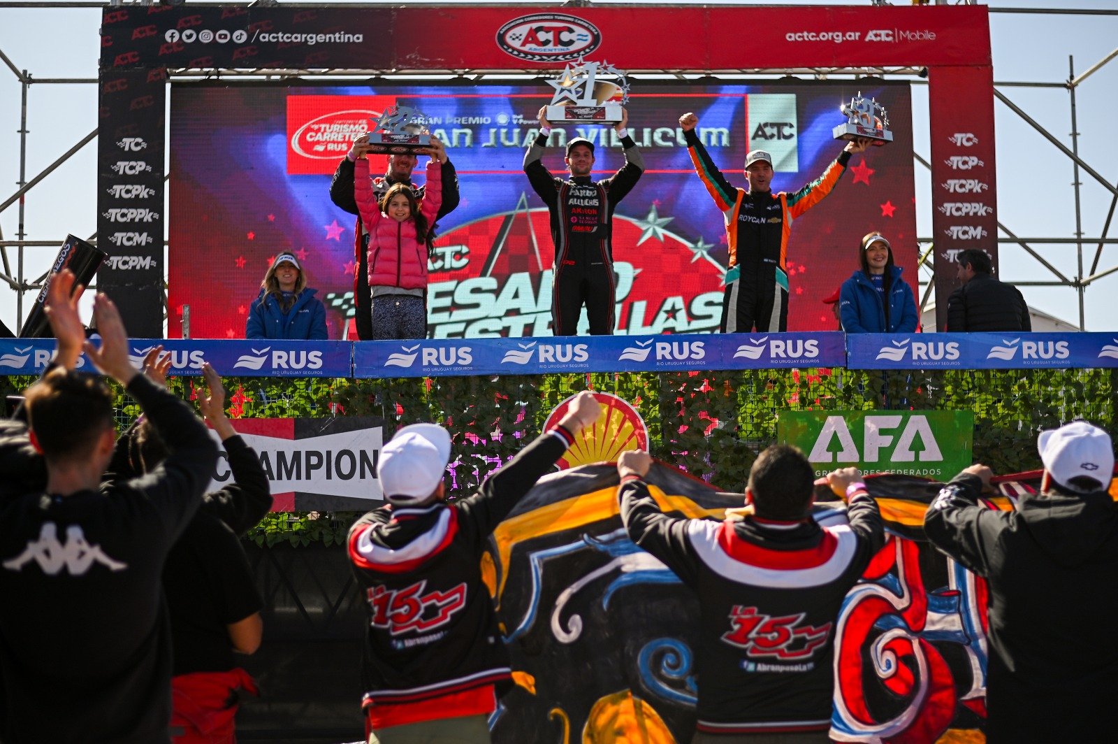 2° fue su compañero de equipo Santiago Mangoni (habrá sido el último podio de una Chevy en el TC? , debido al recambio del parque automotor , en el circuito sanjuanino debutaron 6 autos de nueva generación , sumando en total 24 y completando el 60 por ciento de los autos en pista) . Ricardo “Caito” Risati completó el podio con (Ch Camaro) dando rienda suelta a los fanáticos del “Chivo” en el festejo por el tridente ganador.