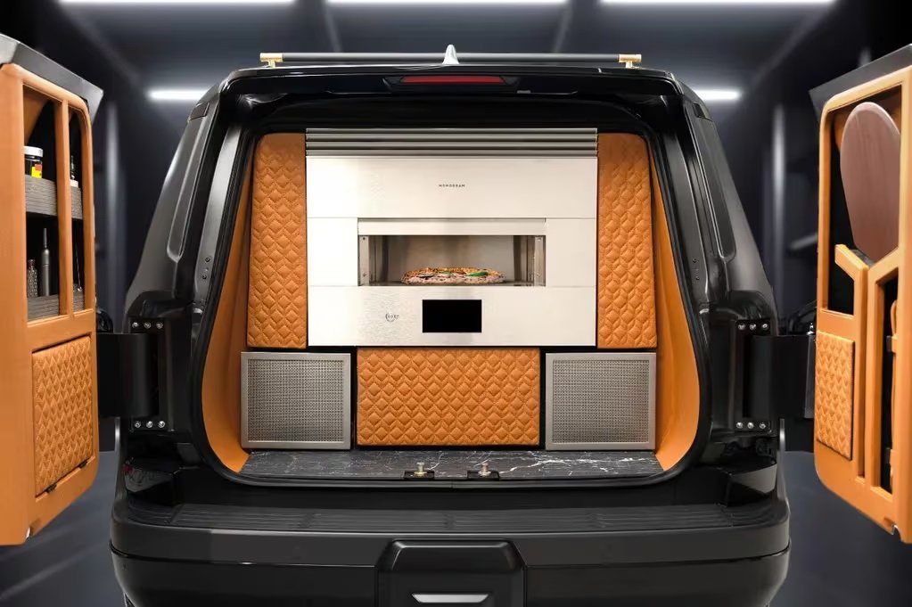 – Por fuera, el todoterreno luce un diseño elegante con detalles en bronce, llantas personalizadas, un portón trasero dividido en dos secciones y una baca en el techo. En realidad, la luneta trasera es ‘falsa’, porque, al abrir el (también falso) baúl, encontramos una serie de compartimentos con vino y wiski. Pero lo más sorprendente es el horno eléctrico para hacer pizzas, diseñado a mano para capturar el rendimiento de un horno de leña de ladrillo.
